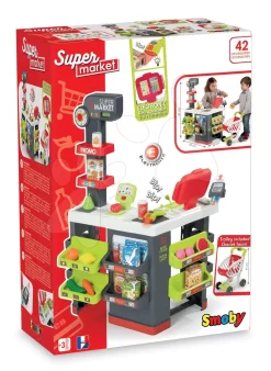 Geschäft Mit Einkaufswagen Supermarket Smoby Rot Mit Elektronischer Kasse Und Scanner, Waage Und 42 Teiligem Zubehör